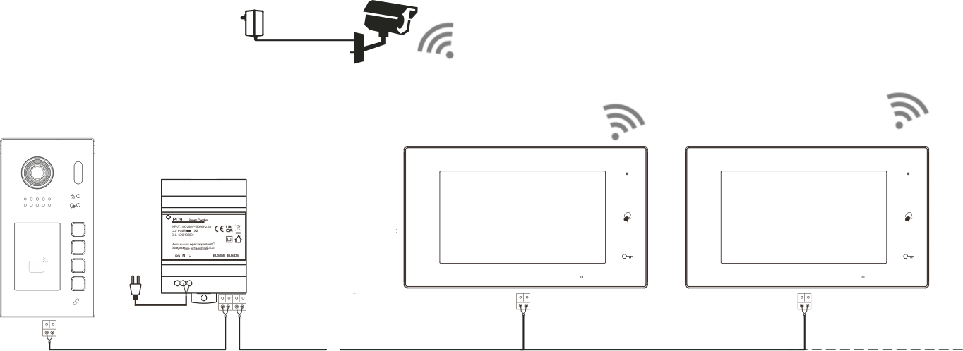 - Pro každých 16 monitorů je třeba napájecí zdroj PA-D2D-PC7D. V případě malých systémů do 8mi monitorů s Wi-Fi (nebo 12ti monitorů bez Wi-Fi) monitorů lze i použít slabší zdroj PA-D2-PC9.