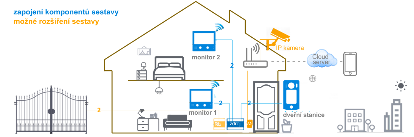 Námi nabízíme sestavy domácích videotelefonů pro rodinné domy, bytové jednotky, kanceláře, školy, obsahují vše potřebné pro provedení instalace. Sestavy lze dále rozšiřovat o další monitory, dveřní kamerové stanice, externí kamery a přídavné moduly umožňující např. přesměrování na mobilní telefon, nebo ovládání vjezdové brány, el. spotřebičů..