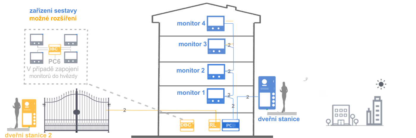 Námi nabízíme sestavy domácích videotelefonů pro rodinné domy, bytové jednotky, kanceláře, školy, obsahují vše potřebné pro provedení instalace. Sestavy lze dále rozšiřovat o další monitory, dveřní kamerové stanice, externí kamery a přídavné moduly umožňující např. přesměrování na mobilní telefon, nebo ovládání vjezdové brány, el. spotřebičů..