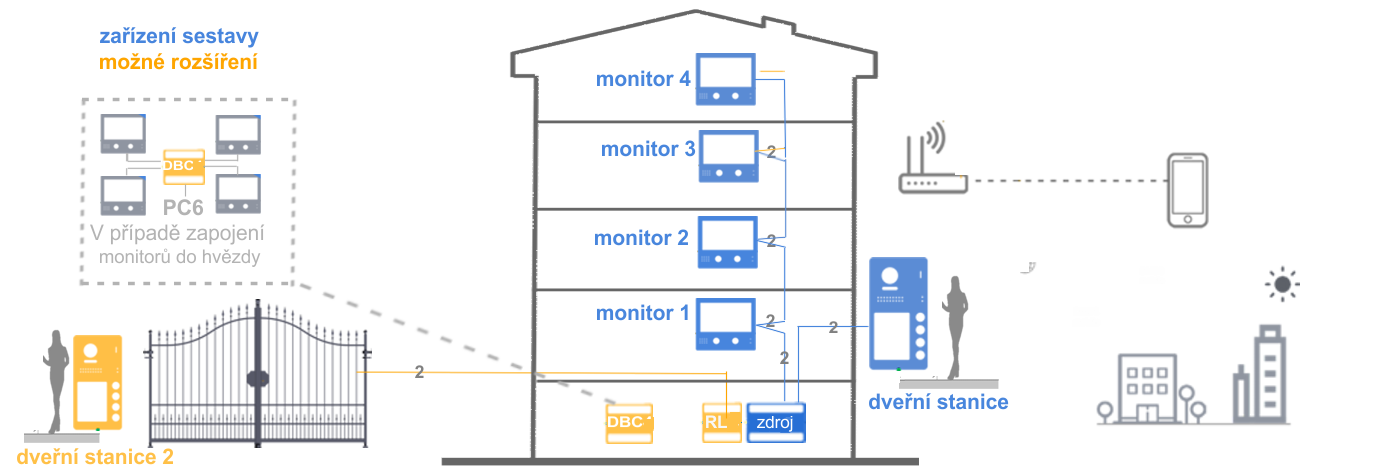 Námi nabízíme sestavy domácích videotelefonů pro rodinné domy, bytové jednotky, kanceláře, školy, obsahují vše potřebné pro provedení instalace. Sestavy lze dále rozšiřovat o další monitory, dveřní kamerové stanice, externí kamery a přídavné moduly umožňující např. přesměrování na mobilní telefon, nebo ovládání vjezdové brány, el. spotřebičů..