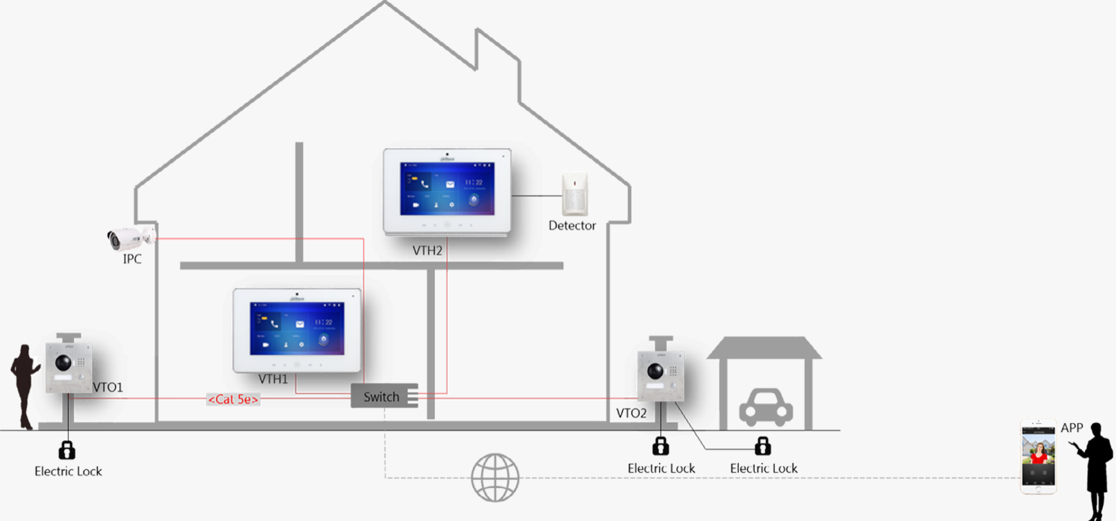 Možnost napájení pomocí 802.3af PoE. Umožňuje připojit až 8 (při zadání z menu monitoru) nebo až 20 (při zadání z webové správy dveřní stanice) IP kamer či kanálů DVR/HCVR/NVR Dahua. Může být přiřazeno až 20 dveřních stanic.