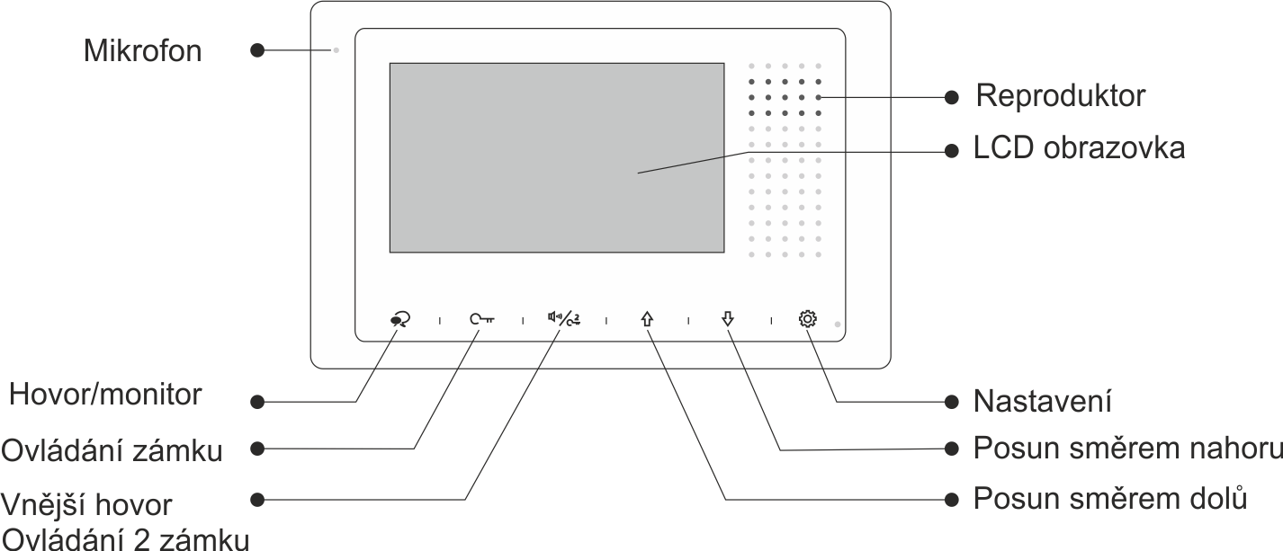 Ovládání zámku: zámek se ovládá prostřednictvím kontaktů dveřní stanice, není napájeno z bytového monitoru (viz. zvolená dveřní stanice)