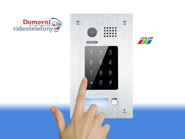 Dveřní stanice pro jedno účastnickou instalaci s přímou tlačítkovou volbou. Obsahuje i Barevná kamera, CCD 1/3", reproduktor. Ovládání zámku. Číselná dotyková klávesnice pro otevření zámku. Kryt pozinkovaná ocel. Venkovní, stupeň krytí IP55. Modrá LED osvícení jmenovky, osvětlení bílým LED světlem při stisknutí tlačítka. Zapuštěná montáž.
