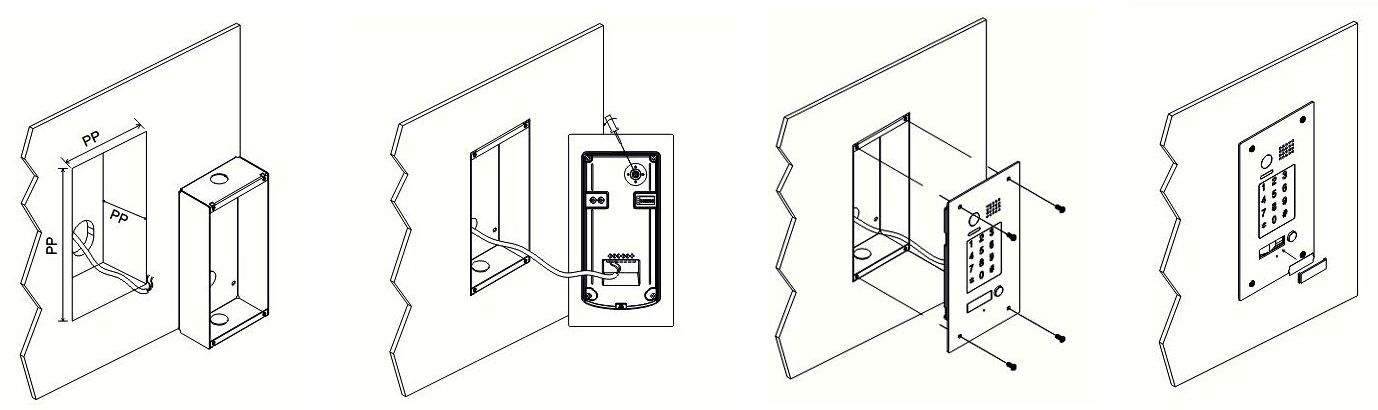 - max. 4 dveřní stanice na jedné sběrnici - zapuštěná montáž, vysekává se otvor hloubky min. 52mm, výšky min. 174mm, šířky min. 90mm
