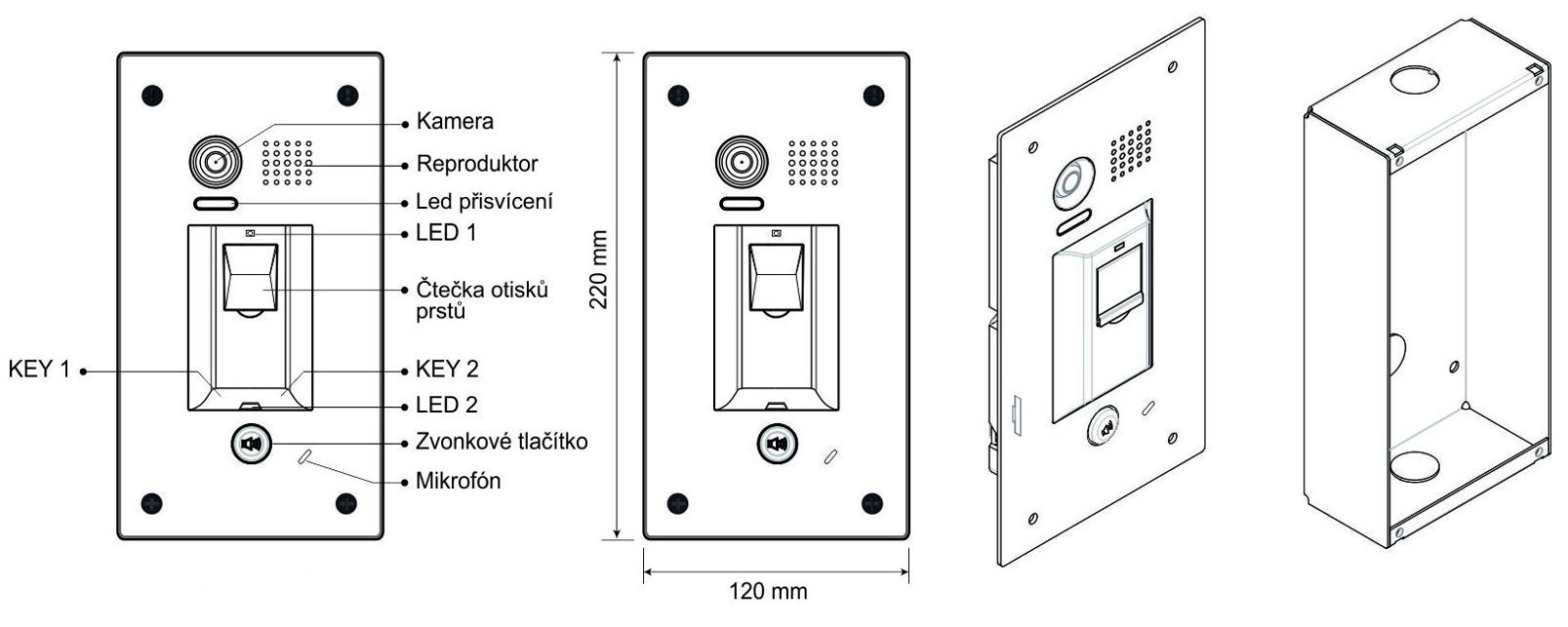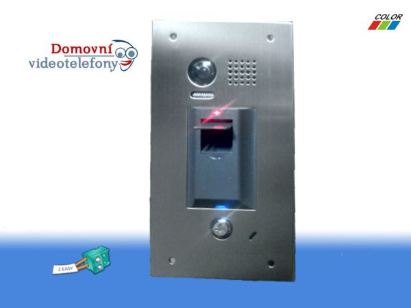 Dveřní stanice pro jednoúčastnický systém s otevíráním vstupu pomocí otisku prstu. Barevná kamera, CCD 1/3", reproduktor. Ovládání zámku a odchodového tlačítka. Kryt hliník, přední část ze 4mm antivandal skla. Krytí IP54. Ovládání jednoho zámku.