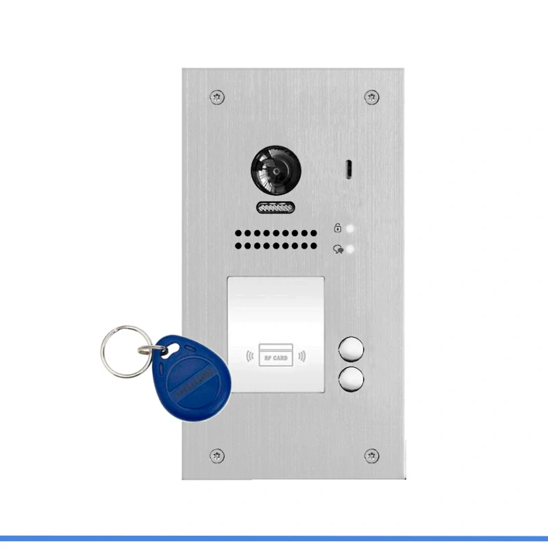 Dveřní stanice pro víceúčastnickou instalaci s přímou tlačítkovou volbou s otevíráním vstupu pomocí RFID čtečky. 2x zvonek. Barevná kamera, CCD 1/3", širokoúhlý objektiv 170°, reproduktor.