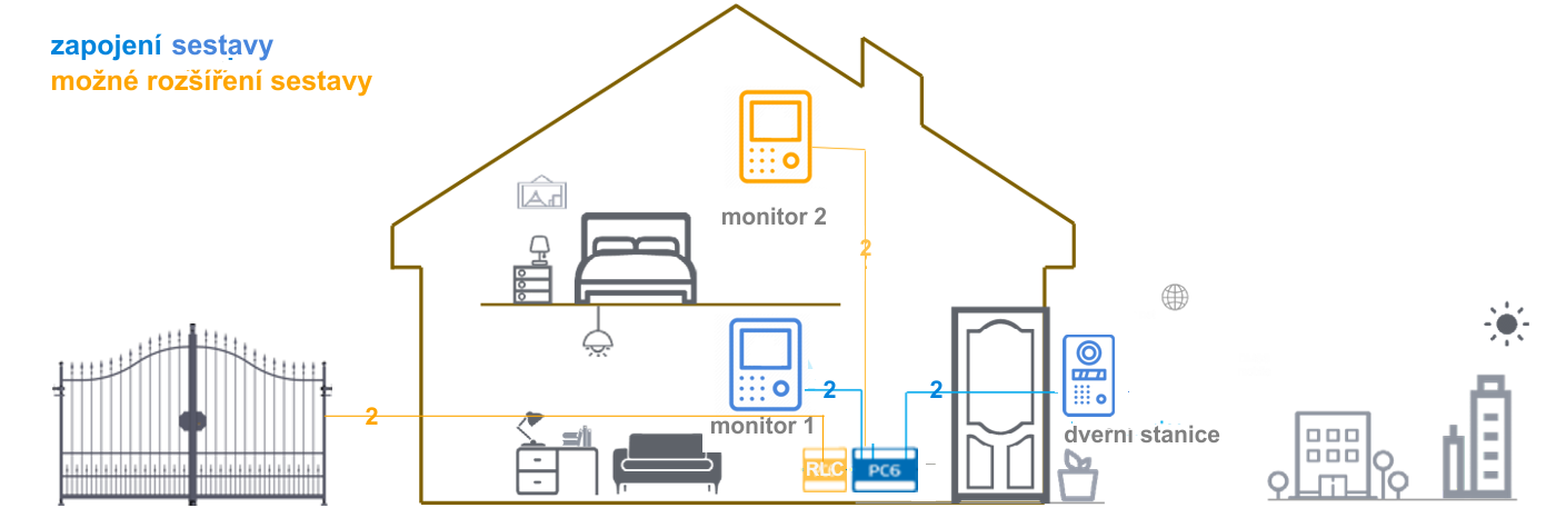 Sestava domácího videotelefonu, určeno pro dům, nebo jednu bytovou jednotku. Sestava obsahuje vše potřebné pro provedení instalace. Systém lze dále rozšiřovat o další monitory, dveřní kamerové stanice, externí kamery a přídavné moduly umožňující např. přesměrování na mobilní telefon, nebo ovládání vjezdové brány, el. spotřebičů.