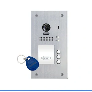 Dveřní stanice pro víceúčastnickou instalaci s přímou tlačítkovou volbou s otevíráním vstupu pomocí Dveřní stanice pro víceúčastnickou instalaci s přímou tlačítkovou volbou a otevíráním vstupu pomocí RFID čtečky, 3x zvonek, barevná kamera, CCD 1/3", širokoúhlý objektiv 170°, reproduktor.